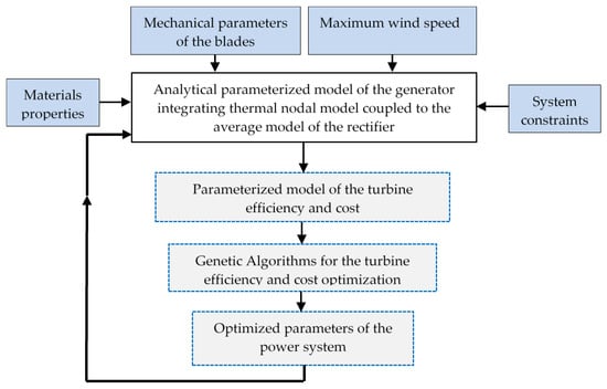 Wind energy research lately focuses on (i) making conversion chain models (turbine–generator–power electronics–storage) better, both physically and numerically, and (ii) creating good ways to design and run these systems right. A lot of studies look at what’s out there now, like analytical and average methods, along with behavior models and random methods. For instance, studies show that people are getting into mixing analytical modeling with numerical checking to get both good results and reasonable computer costs [,,]. Other studies are about how movement works and modeling the mechanics of blades, hubs, and towers to get better stress predictions and keep things steady [,]. Also, researchers came up with a method using Archimedes’ idea for getting the most power from wind systems, which gets there fast and stays steady when the wind changes []. In the electrical and power modeling field, several contributions are dedicated to the modeling of permanent magnet synchronous generators and converters for stability and grid integration studies [,]. The average value models of the rectifiers and inverters offer an important reduction in simulation time while keeping the average values necessary for the optimization algorithms [,]. Simultaneously, in the literature on the optimization methods, one notices the use of genetic algorithms and their hybridizations in order to solve multi-objective problems of efficiency, cost, and reliability [,,,]. Even with these improvements, there are still some issues. Models are usually looked at on their own. Electromagnetic-thermal coupling is not usually considered as well. Plus, the standards for when to stop optimizations are not the same. Because of this, we need to look at things in a joined-up and logical way, thinking about the physics, energy, and algorithms together.