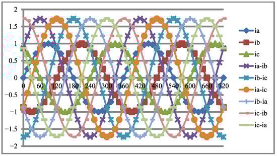 V, E, and I refer, respectively, to the phase voltage, electromotive force, and current vectors, while L and M denote the phase’s self and mutual inductances.