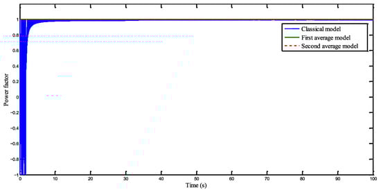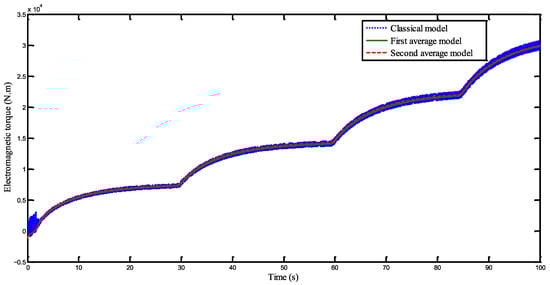 In order to strengthen the credibility of the proposed model, a deep comparative study has been carried out between the average analytical model and the detailed switching model available in MATLAB/Simulink. As can be seen from the results, although no explicit switching is present in the averaged model, the key energy values such as average rectified voltage, input current, ripple factor, and electromagnetic power deviate very slightly from the detailed model while systematically agreeing on the mid-scale dynamic behavior. These observations follow the conclusions available in the literature, where it was shown that average models faithfully reproduce quantities of interest in energy optimization and control studies [,,]. Moreover, the use of the average analytical model reduces the computation time drastically and allows this model to be used within a stochastic optimization loop, something impossible with the detailed model due to its heavy computational cost. As shown by the consistency between experimental and simulated curves, the averaged model constitutes a sufficiently faithful representation for systemic design while bringing the speed indispensable to the optimization algorithms used in this study.