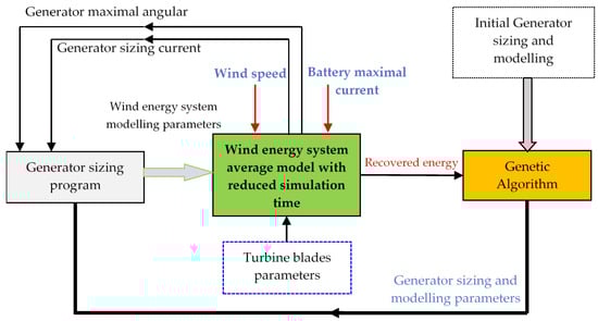 Wind energy is one of the major renewable energy sources today, fully contributing to the transition process of energy production in the world and to the reduction in greenhouse gas emissions. Because of several technological advances regarding energy conversion systems and cost per kilowatt produced, the wind power systems have become irreplaceable parts of the sustainable energy mix [,,]. In this respect, according to several recent studies, the global installed capacity of wind turbines today, sustained by international policies of decarbonization and increased competitiveness of the technologies, exceeds a few hundred gigawatts, with an average annual growth rate of over 10% []. However, despite this progress, the design and optimization of wind energy systems remain complex challenges. Indeed, the power conversion chain involves the close interaction of electrical, mechanical, magnetic, and thermal phenomena, making their overall modeling difficult and computationally expensive []. Optimizing energy performance requires an accurate representation of each subsystem: the turbine, the generator, converters, storage, and control. These detailed models, often derived from behavioral or numerical approaches, have long simulation times, which are poorly suited to the multi-objective optimization algorithms used in system designs [,,]. In this context, analytical approaches and average-value models represent a promising alternative. These models allow for the representation of essential physical phenomena while significantly reducing computation time, thus facilitating their integration into stochastic optimization processes such as genetic algorithms. Their use makes it easier to find optimal trade-offs between recovered power, overall efficiency, cost, and system reliability [,,].