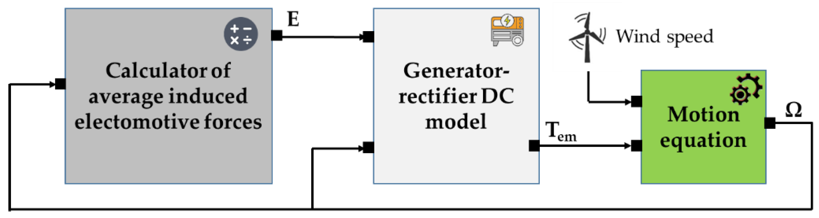 The figure shows the overall scheme of the conversion chain and the most important energy flows between the turbine, permanent magnet synchronous generator (PMSG), rectifier, and battery. This is a deliberately simplified model that brings out the essential functional relationships of the components without showing the internal equations, so a general understanding may be gained before the analytical and average models that will be discussed in the following sections are presented.