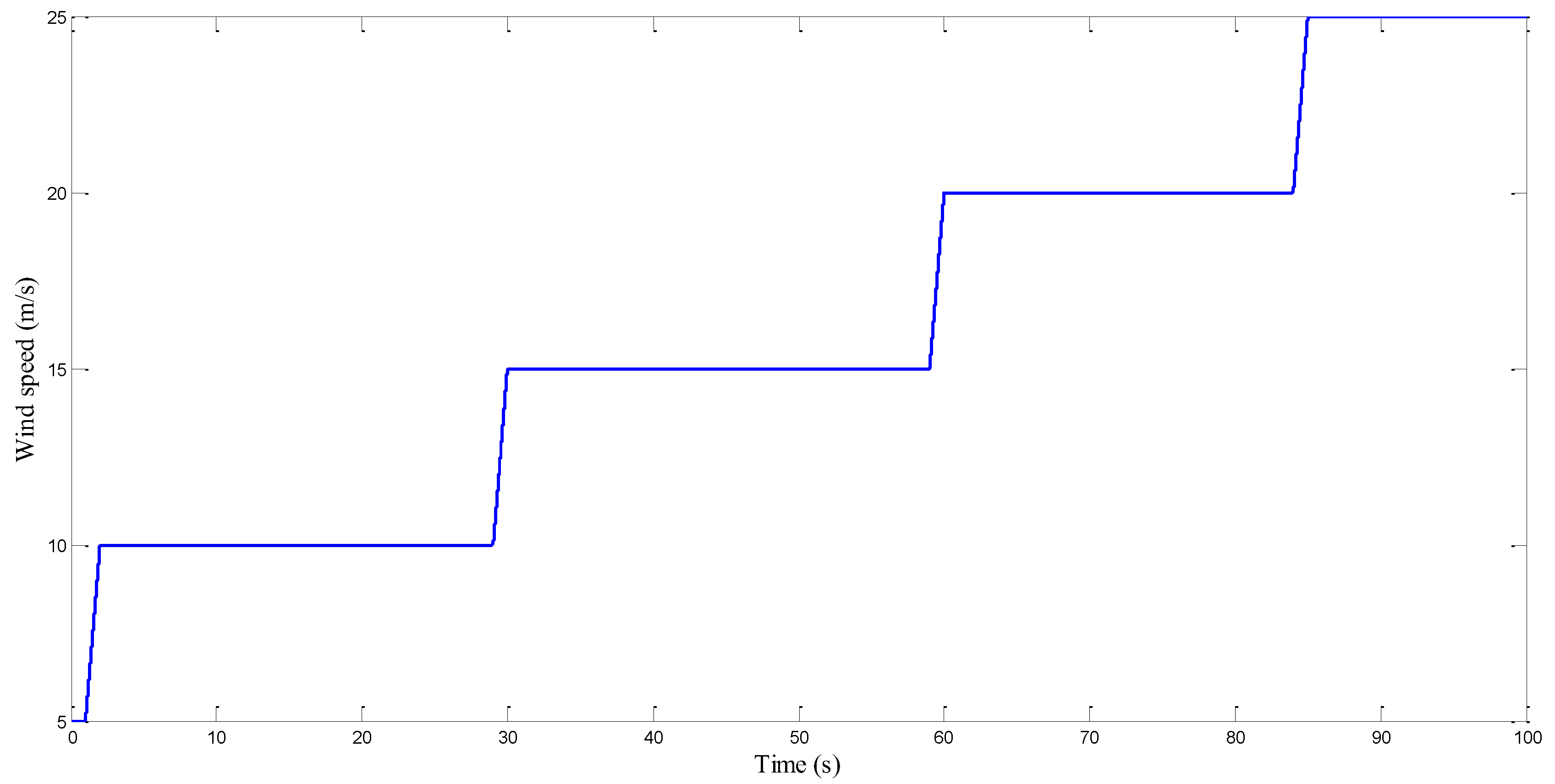 Table 1 were adopted to ensure the physical consistency and practical applicability of the simulations. These values are not arbitrary; they are derived from the technical specifications of a real, low-power wind turbine system, which serves as a reference for the sizing and validation of the model. Their use in the average models ensures a realistic and reproducible simulation framework, enhancing the reliability of the optimization results obtained. According to the data provided by the analytical model of the wind turbine, simulations of the power chain model were conducted for all three cases.