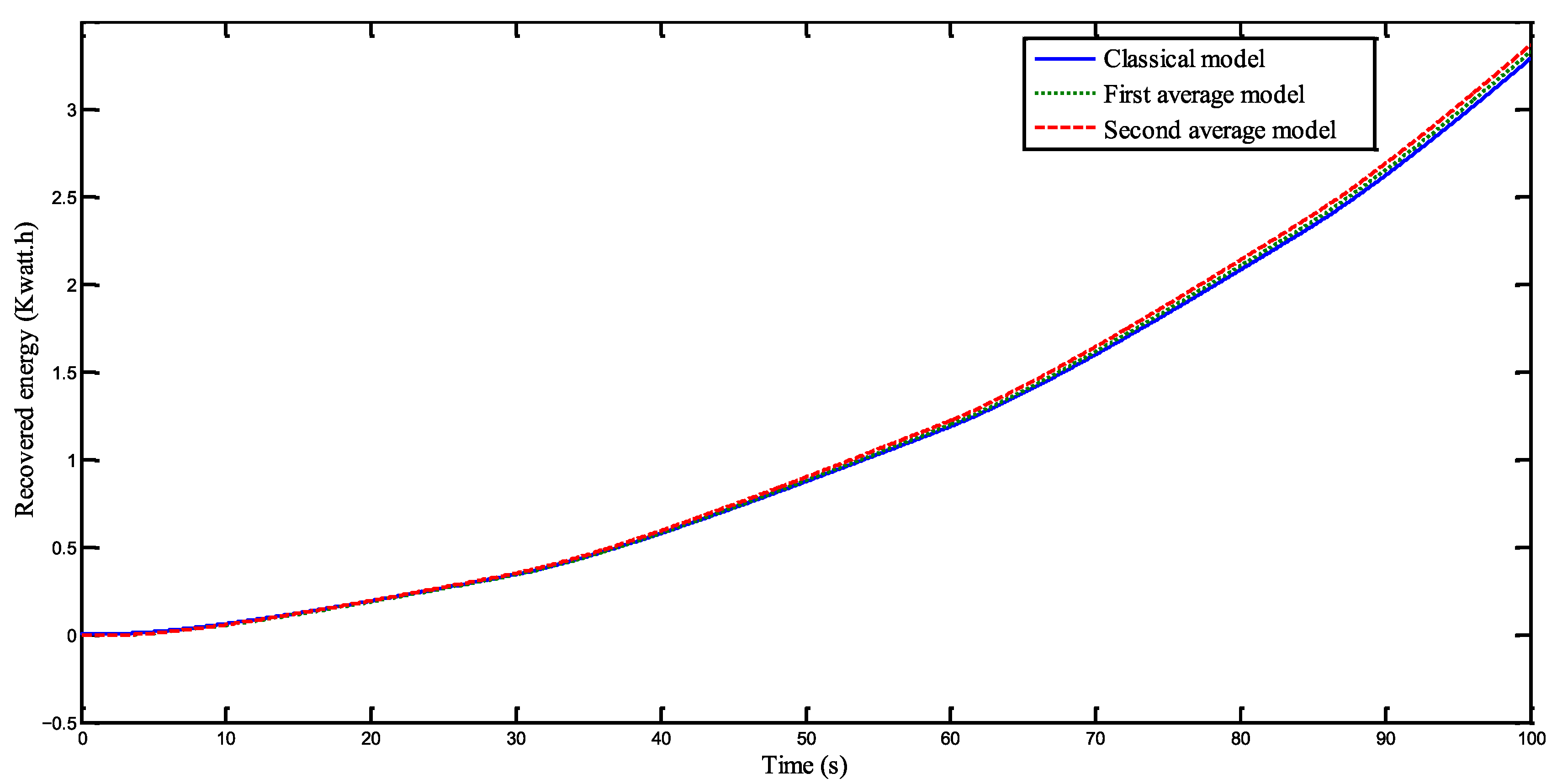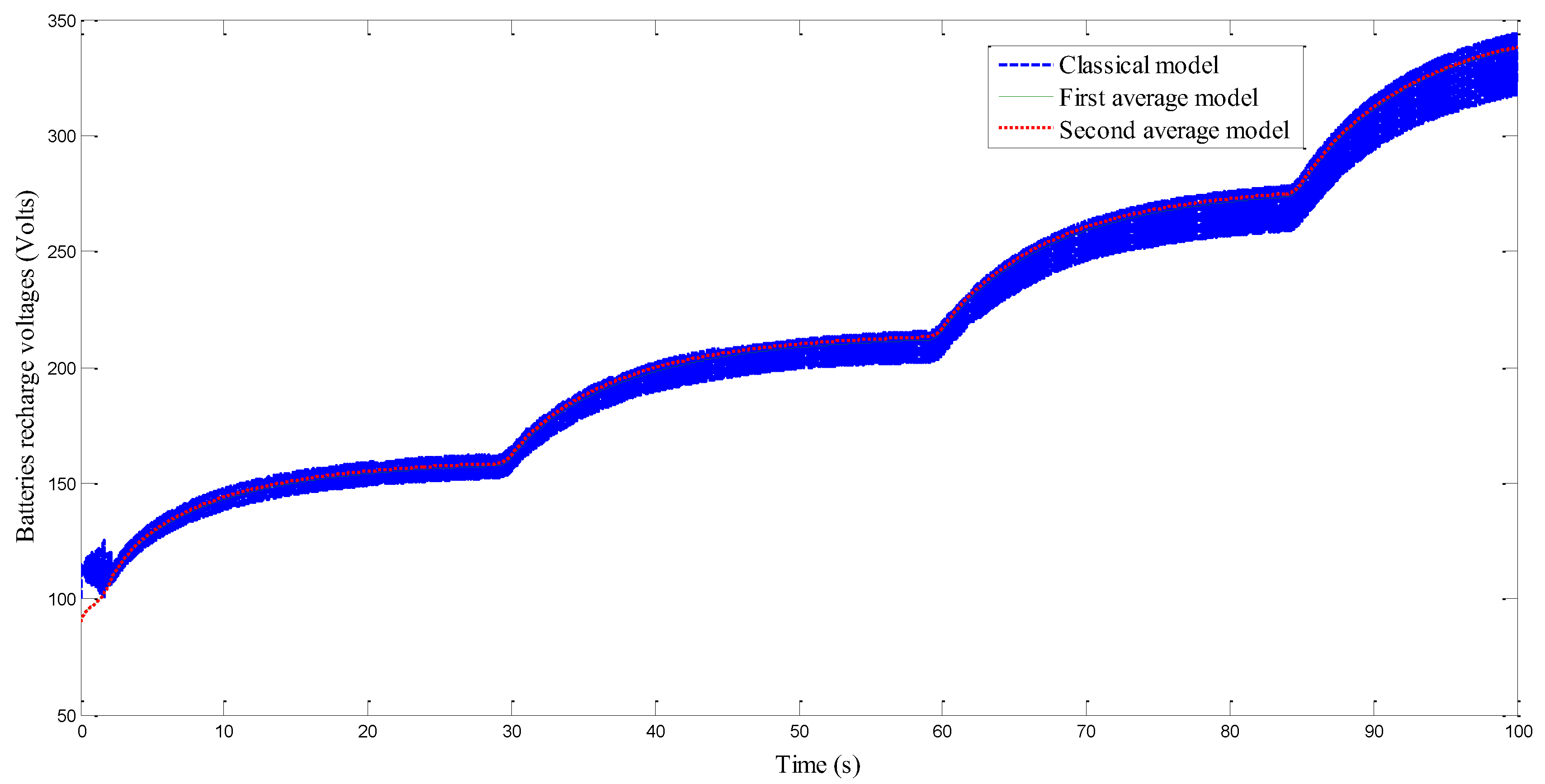 Figure 16 illustrates the time evolution of the battery recharging voltage for the three model cases. It also highlights the close similarity among the three results, which confirms the validity of the developed study.