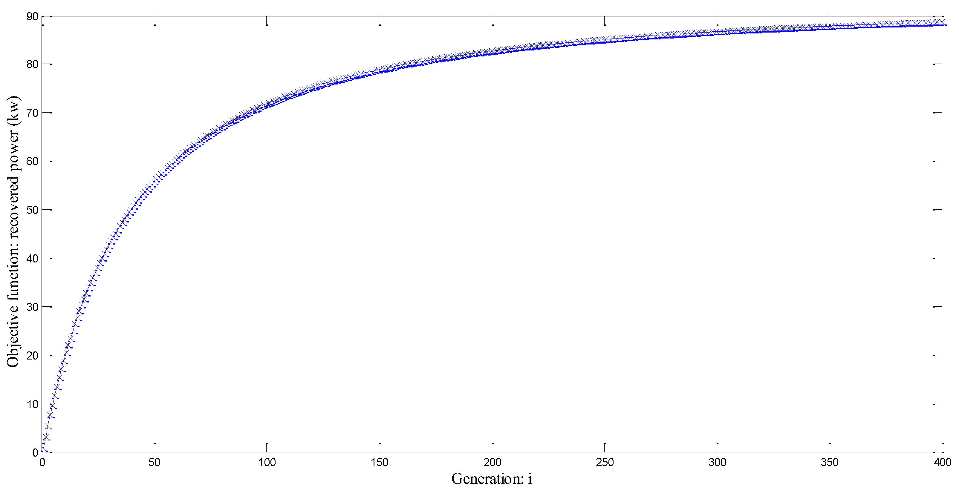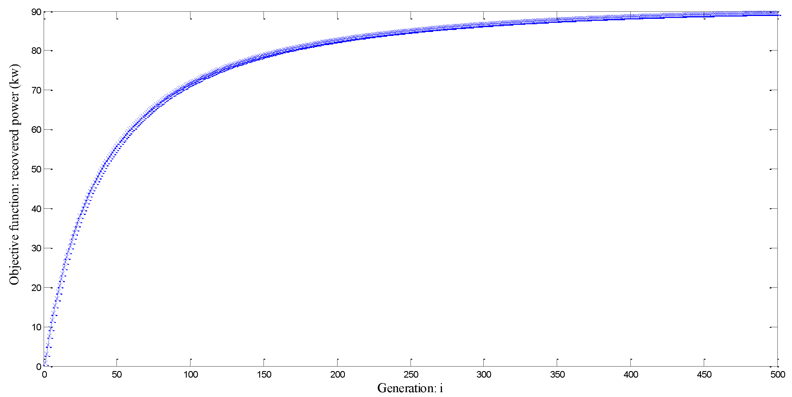 Figure 24 illustrates the optimal value of the recovered power (kw) in function of the total number of generations.