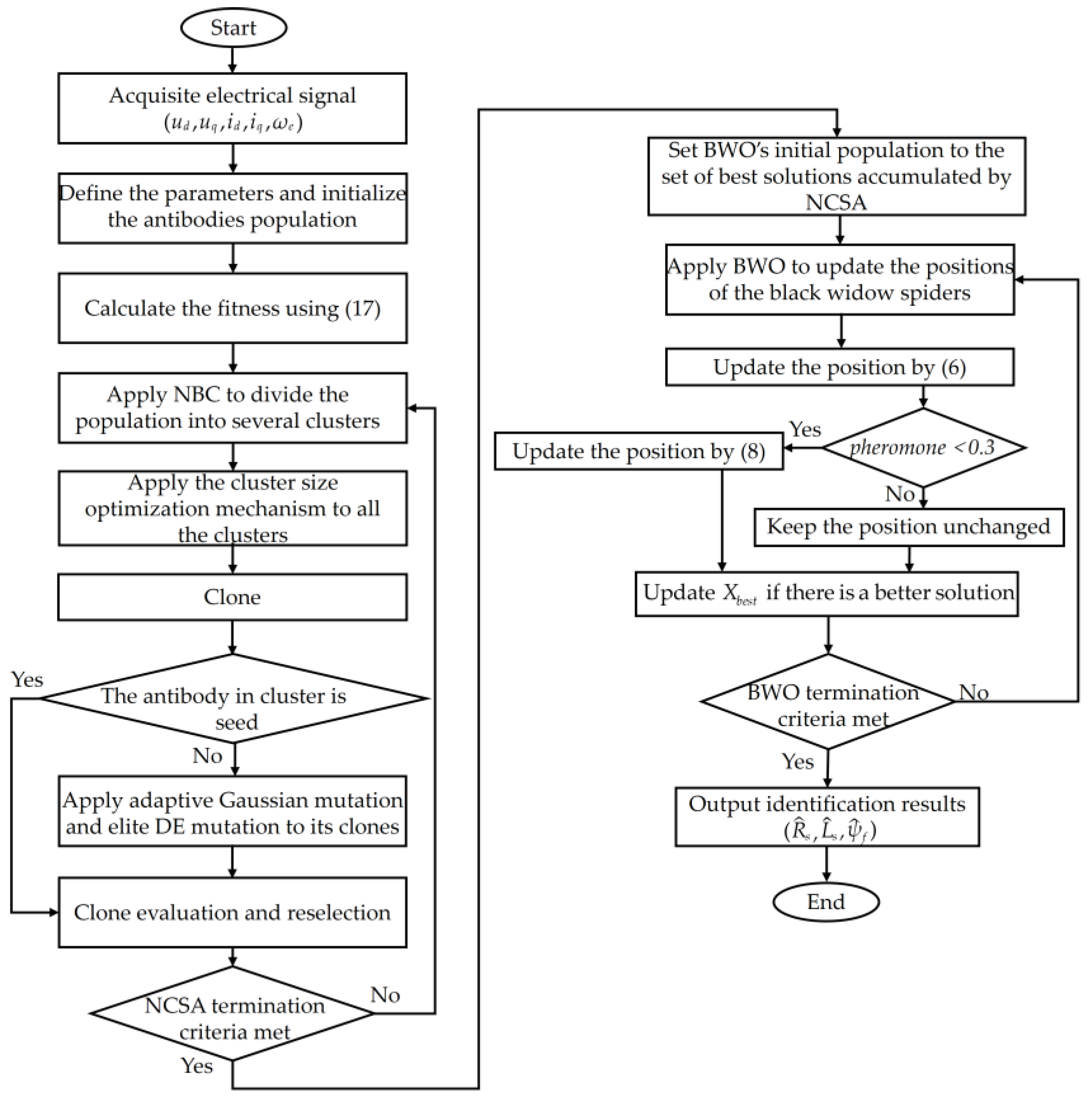 Figure 4 shows the flowchart of the NCS-BWO algorithm for PMSM parameter identification.