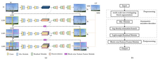 The workflow of the algorithm proposed in this paper is illustrated in Figure 1b. First, the input hazy image is divided into non-overlapping blocks according to the aforementioned 4 scales, and then each block under different scales is separately fed into the asymmetric encoder–decoder at the corresponding level. Blocks and scales interact through cross-scale feature flow—after bilinear upsampling, the block features of the previous scale serve as the initialization features of the corresponding block in the next scale, ensuring the coherence of block features across different scales. Specifically, the encoder embeds a Mix structure module to construct the dual-branch attention mechanism, and at the same time, the fog density estimation branch calculates the haze concentration based on the dark channel mean to dynamically adjust the weight allocation between the low-frequency global perception branch and the high-frequency local enhancement branch in the Mix module; the decoder adopts DSC to construct lightweight residual modules for feature reconstruction. Then, the inter-block feature fusion module performs weighted fusion processing on the reconstructed features of each block at layers B1 (1/2) and B2 (1/4), eliminating inter-block artifacts caused by multi-block division. Finally, the fused features are output as haze-free images.