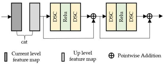 Within the architecture proposed in this paper, asymmetry is primarily achieved through the differentiation of modules in the encoder and decoder branches. The decoder module is composed of 2 deconvolutional layers, 3 lightweight residual modules, and 1 convolutional layer. Each of these 3 lightweight residual modules contains two DSC, with a ReLU activation function placed in the middle, as illustrated in Figure 2. The encoder module consists of 3 convolutional layers and 3 hybrid modules. Specifically, each module within the residual modules comprises two standard convolutions, with a ReLU activation function inserted in between, as illustrated in Figure 3.