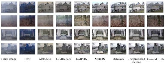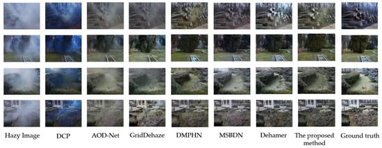 To evaluate the performance of the proposed algorithm, this study selected four representative and advanced dehazing algorithms for comparison: DCP [], AOD-Net [], GridDehaze [], DMPHN [], MSBDN [] and Dehamer []. To ensure the reliability of the comparative results, all compared methods were trained and tested under a unified experimental environment, including consistent hardware configurations, training data, and test sets, thereby eliminating the influence of environmental factors on the performance evaluation.