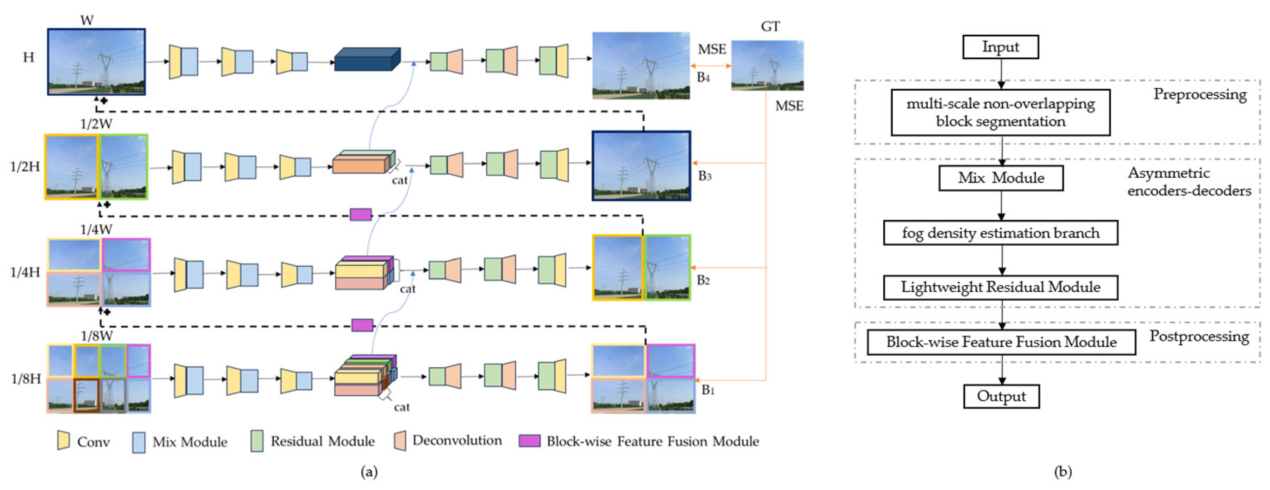 Figure 1b. First, the input hazy image is divided into non-overlapping blocks according to the aforementioned 4 scales, and then each block under different scales is separately fed into the asymmetric encoder–decoder at the corresponding level. Blocks and scales interact through cross-scale feature flow—after bilinear upsampling, the block features of the previous scale serve as the initialization features of the corresponding block in the next scale, ensuring the coherence of block features across different scales. Specifically, the encoder embeds a Mix structure module to construct the dual-branch attention mechanism, and at the same time, the fog density estimation branch calculates the haze concentration based on the dark channel mean to dynamically adjust the weight allocation between the low-frequency global perception branch and the high-frequency local enhancement branch in the Mix module; the decoder adopts DSC to construct lightweight residual modules for feature reconstruction. Then, the inter-block feature fusion module performs weighted fusion processing on the reconstructed features of each block at layers B
