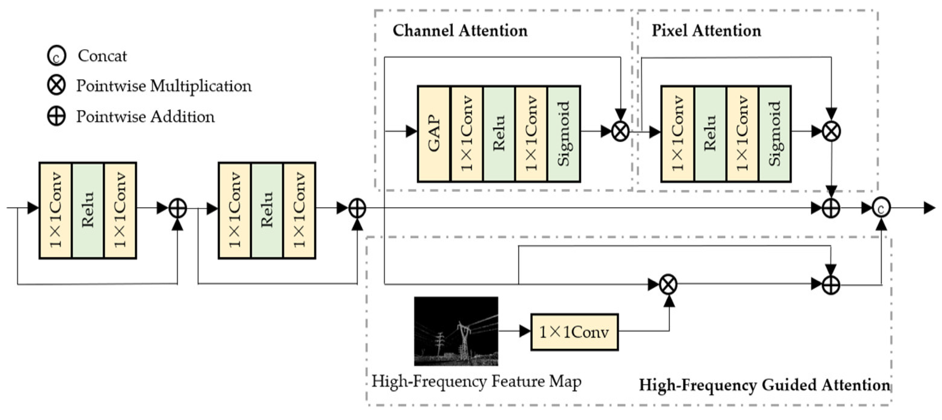 This feature attention mechanism adopts a differentiated weight allocation strategy to dynamically adjust inter-channel dependencies and spatial features, assigning adaptive attention weights to different channels and pixels. Furthermore, high-frequency features, which provide abundant multi-scale edge prior information, are introduced as attention modulation factors to guide the network in strengthening edge regions during feature learning. This mechanism allocates more weights to image edge regions, thereby improving the dehazing effect in dense haze regions.