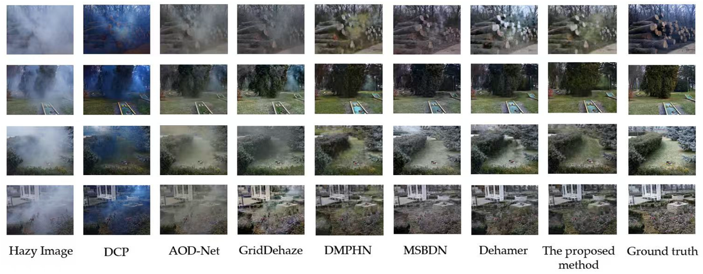 Despite these advantages, the algorithm still has limitations in extremely dense haze scenarios: when the haze concentration is excessively high (e.g., the area around the wooden stake in