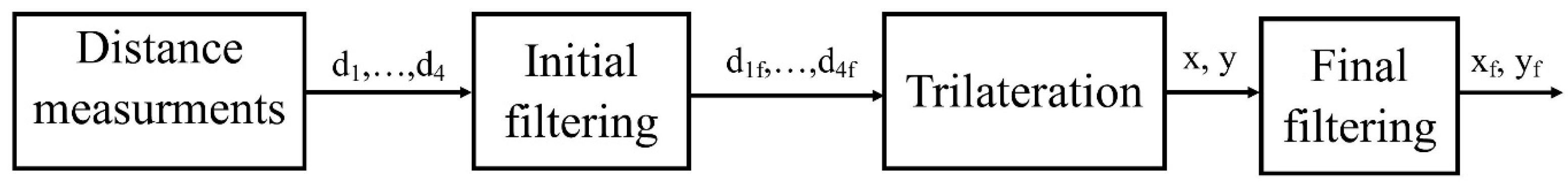 - Rykała, Ł.; Przybysz, M.; Cieślik, K.; Krogul, P.; Typiak, R.; Typiak, A. Research on selected location algorithms for the UGV operating in a follow-me scenario based on ultra-wideband positioning system. Adv. Sci. Technol. Res. J. 2025, 19, 1–14. [Google Scholar] [CrossRef]