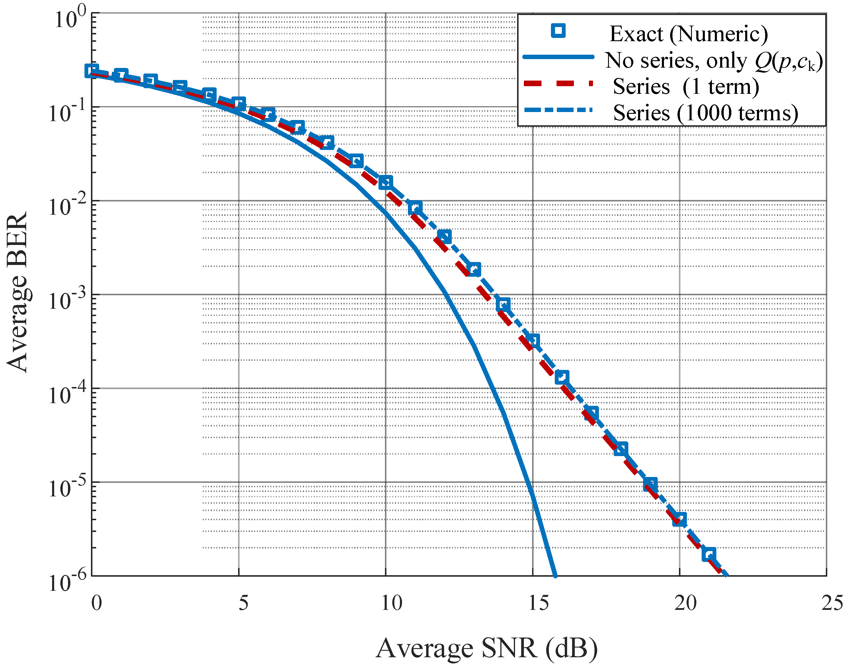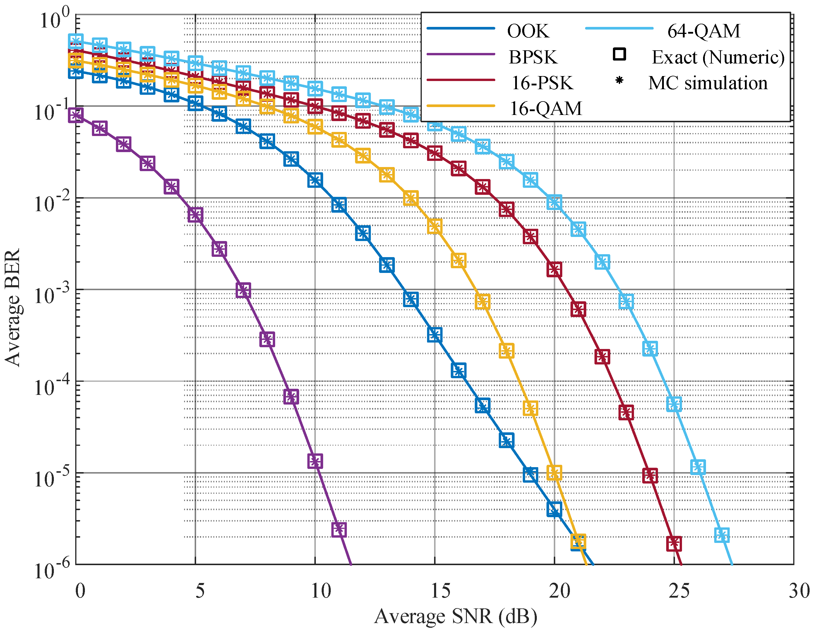 - Using this SNR model as a foundation, we obtain unified closed-form formulations for fundamental performance measures—outage probability, average BER, and ergodic capacity—applicable to various modulation formats.