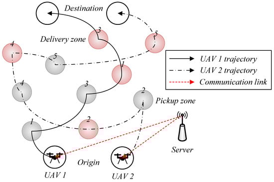Following the extensive progress in UAV-assisted wireless communications, attention has increasingly shifted toward leveraging UAVs for efficient and autonomous logistics operations [,,,,,]. In particular, UAV-enabled parcel delivery has become a vibrant research area, aiming to enhance delivery efficiency, reduce operational costs, and ensure system reliability. Early study [] conceptualized UAV-based delivery as an extension of vehicle routing, developing formulations that balance delivery time and operational cost under resource constraints. Moreover, refs. [,] incorporated stochastic task dynamics and three-dimensional (3D) trajectory optimization to manage uncertainty in task arrivals, payload limits, and scheduling dependencies. As UAV fleets expanded, several representative studies explored different aspects of cooperative multi-UAV delivery. In particular, ref. [] examined swarm-oriented UAV delivery frameworks, assessing their operational performance and scalability across different logistics models. In addition, ref. [] proposed a distributed and adaptive coordination algorithm for formation-based UAV missions, allowing each UAV to make localized routing decisions while preserving global coherence and avoiding inter-vehicle interference in dynamic environments. Meanwhile, ref. [] explored the routing and scheduling problem for multiple UAVs with varying payload capacities and uncertain delays, introducing a hybrid genetic and simulated annealing approach to achieve computational efficiency and solution robustness.