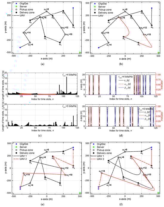 Trajectory and resource allocation of proposed scheme. (a) Horizontal trajectory when = 0 bits/Hz. (b) Horizontal trajectory when = 4 bits/Hz. Horizontal trajectory when = 4 bits/Hz. (c) Length of time slots. (d) Vertical trajectory and pickup/drop-off indicator. (e) Horizontal trajectory when = 0 bits/Hz and M = 2. (f) Horizontal trajectory when = 4 bits/Hz and M = 2.