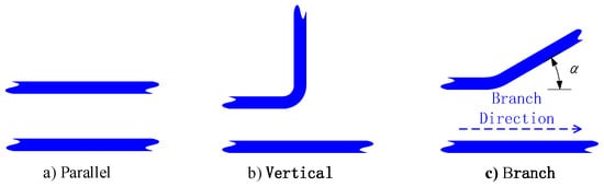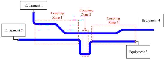 For two physically implemented cables exhibiting interference coupling, their spatial relative relationship can be approximated as encompassing three typical configurations: parallel, perpendicular, and branched. Defining the parallel and branching structures within two physical cables as coupled regions, multiple contiguous coupled regions may exist between the two physical cables. Vertical structures between these regions prevent direct connection between adjacent coupling regions, as shown in Figure 3. When predicting the magnitude of crosstalk in physical cables, accurate crosstalk prediction results can only be obtained by considering the crosstalk conditions across all coupling regions.