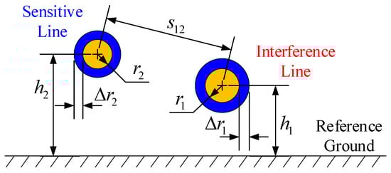 and represent the core radii of the interfering cable and the sensitive cable, respectively; and represent the insulation thicknesses of the two cables, respectively. The electrical conductivities of the insulation layers in both transmission lines are zero, their relative magnetic permeabilities are both 1, and their relative permittivities are and , respectively. and represent the distances between the interference cable and the sensitive cable and the metal wall surface, respectively; represents the distance between the two cables.