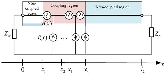 Under the weak coupling assumption, the actual cable crosstalk response can be equivalently modeled as the superposition of a series of voltage sources in series and current sources in parallel distributed along the sensitive cable, combined with the load response generated at the sensitive cable port, as shown in Figure 6 [,,,,].