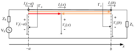 Under steady-state conditions, the voltage and current at any point along the interference cable can be regarded as the superposition of an incident wave component propagating in the “” direction and a reflected wave component propagating in the “” direction, as shown in Figure 8. and represent the reflection coefficients at the source end and load end of the interference cable, respectively.