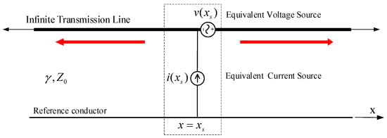 When passing through the excitation source, both the voltage and current on the transmission line are discontinuous, exhibiting abrupt changes at position . Based on the boundary conditions at the excitation source location, the formulas for calculating the voltage and current at any observed point along the transmission line are as follows: