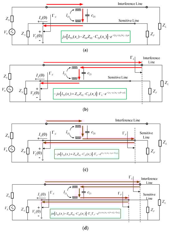 As seen from Formulas (38) and (39), under the weak coupling assumption, interference signals propagating along the interference cable enter the sensitive cable at a specific point in the interconnecting cables via mutual inductance and mutual capacitance between the cables. They then propagate along the sensitive cable toward both ends: one portion directly reaches the coupling response observation port, while another portion reflects off the other end of the sensitive cable and arrives at the observation port. These two paths, respectively, represent the direct coupling and reflected coupling modes of the interference signal to the sensitive cable port. Therefore, in a three-conductor transmission line formed by two actual cables and a reference conductor, electromagnetic interference coupling paths can be subdivided into four categories as shown in Figure 10.