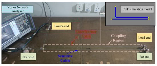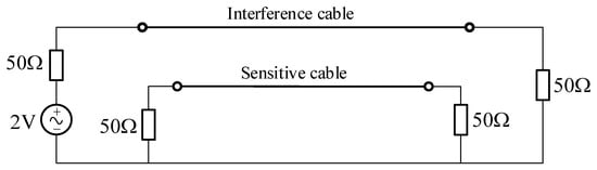 Using the ZND VNA (Rohde & Schwarz, Munich, Germany) to test interference coupling between two installed cables on a metal ground plane, the equivalent circuit measuring the frequency-domain response of electromagnetic coupling between the two cables is shown in Figure 11, based on the testing principle of the VNA. Since the signal output from the VNA port undergoes voltage division through a internal impedance, the transmission coefficient measured between the source end of the interfering cable and the port of the sensitive cable equals the crosstalk voltage response at the sensitive cable port when the interference source voltage is 2 V.