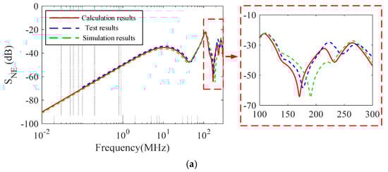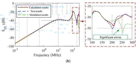 Based on the crosstalk calculation method described in this paper, the crosstalk coefficient curve between cables in the model can be obtained. The comparison results between this curve and the crosstalk coefficients obtained from CST simulation and actual measurements are shown in Figure 13.