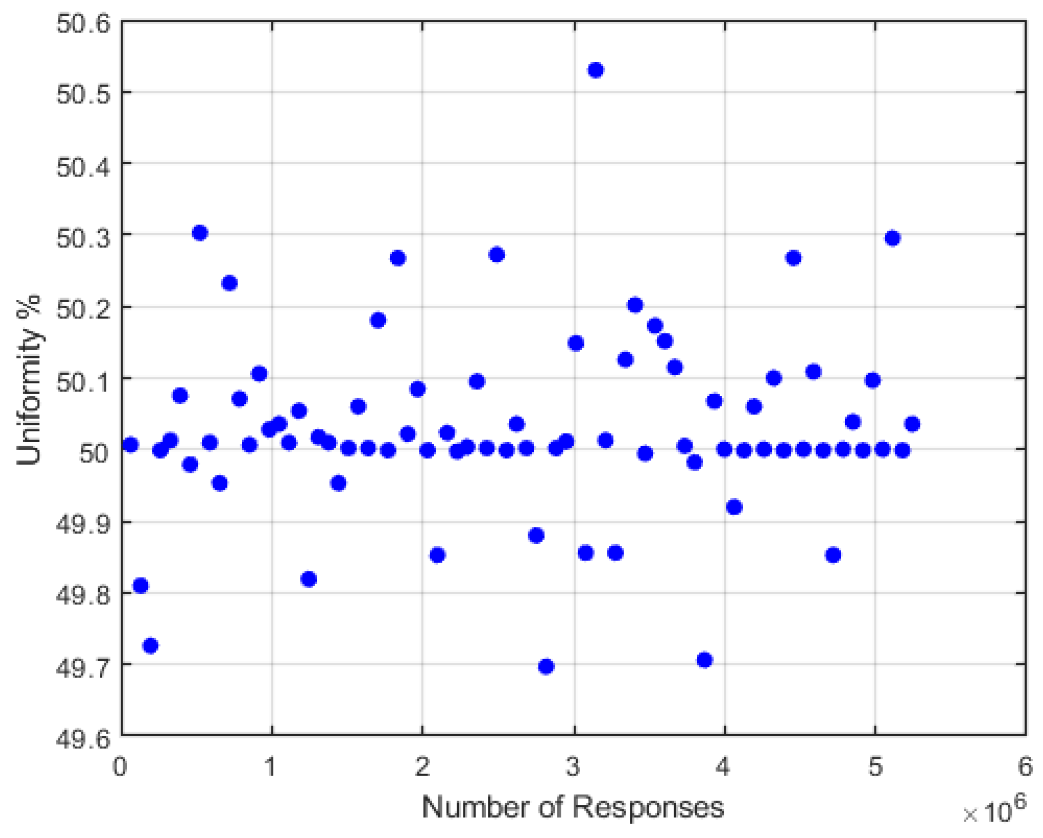 ), this yields approximately 262,140 unique responses per device. In practice, we used 5 groups of challenges, with each group containing 65,535 bits, across 4 different polynomial feedbacks per FPGA, producing a total of 5.2 million response bits. These groups of challenges with their seeds were generated as pseudorandom sequences to ensure diversity and reduce bias in the evaluation. This dataset was sufficient to thoroughly evaluate uniformity, uniqueness, randomness via NIST statistical tests, and resistance to machine learning attacks.