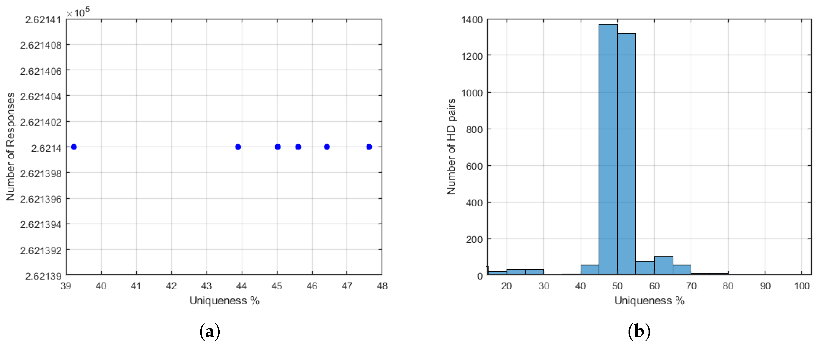 The routing and placement of the design logic elements within the FPGA can greatly impact the performance metrics, particularly in terms of uniqueness. When the design is left to the automated synthesis and routing of the Quartus tool, it results in identical CRPs and no observable uniqueness. Therefore, the uniqueness and unpredictability of our PUF arise only when routing is preserved, confirming the physical entropy source of the proposed design. The challenge–response pairs are exchanged between a PC and the FPGA through the RS-232 serial communication interface. The experimental results were then recorded and further processed using MATLAB version R2024b.