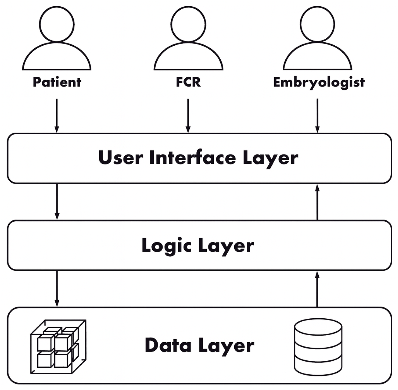 The overall architecture of EmbryoTrust follows a three-layer model consisting of the User Interface, Logic, and Data layers, as shown in