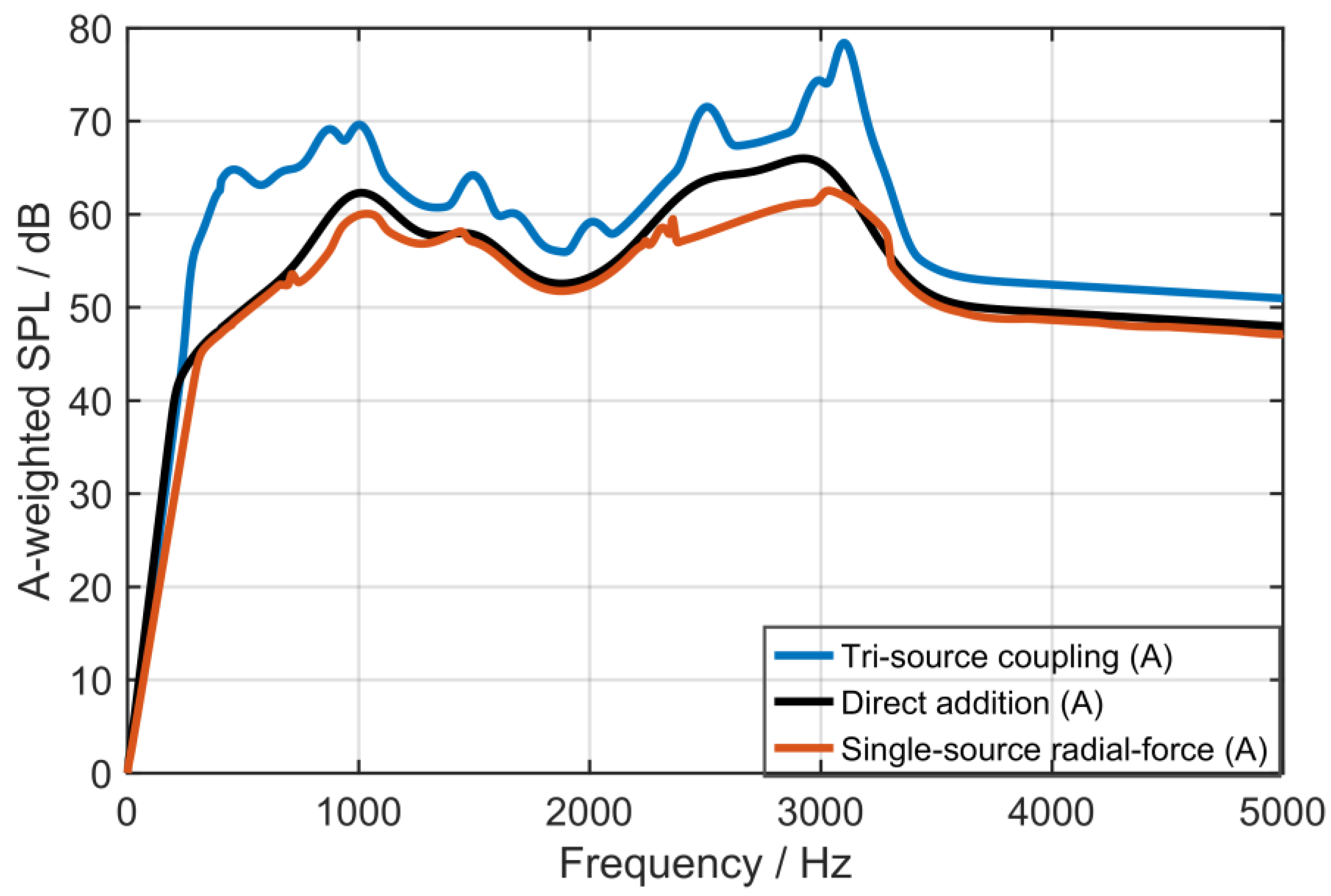 - An integrated computational chain combining electromagnetic FEA, structural vibro-acoustic coupling, and BEM acoustic analysis is established for a 6-pole 36-slot PMSM; using A-weighted SPL as a unified metric, it enables quantitative assessment of the coupled contributions of the three excitation sources on a consistent scale.