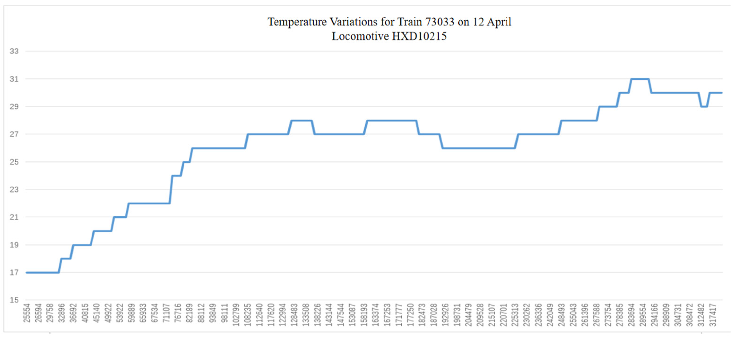 The data indicates that following the train’s departure from Hudong No. 2 Depot (with the kilometre marker approximately at K25km+500m when the button was pressed), the operating temperature gradually rose from 17 °C to 25.5 °C until reaching K82km+112m. This temperature increase occurred during the period from 19:06:00 to 21:46:30, Over approximately 2 h and 40 min of operation, the temperature increased by 8.5 °C. Notably, the section at K64km on the Daqin Line—where abnormal increases in train pipe pressure are frequently reported—falls precisely within this interval of sustained temperature rise.