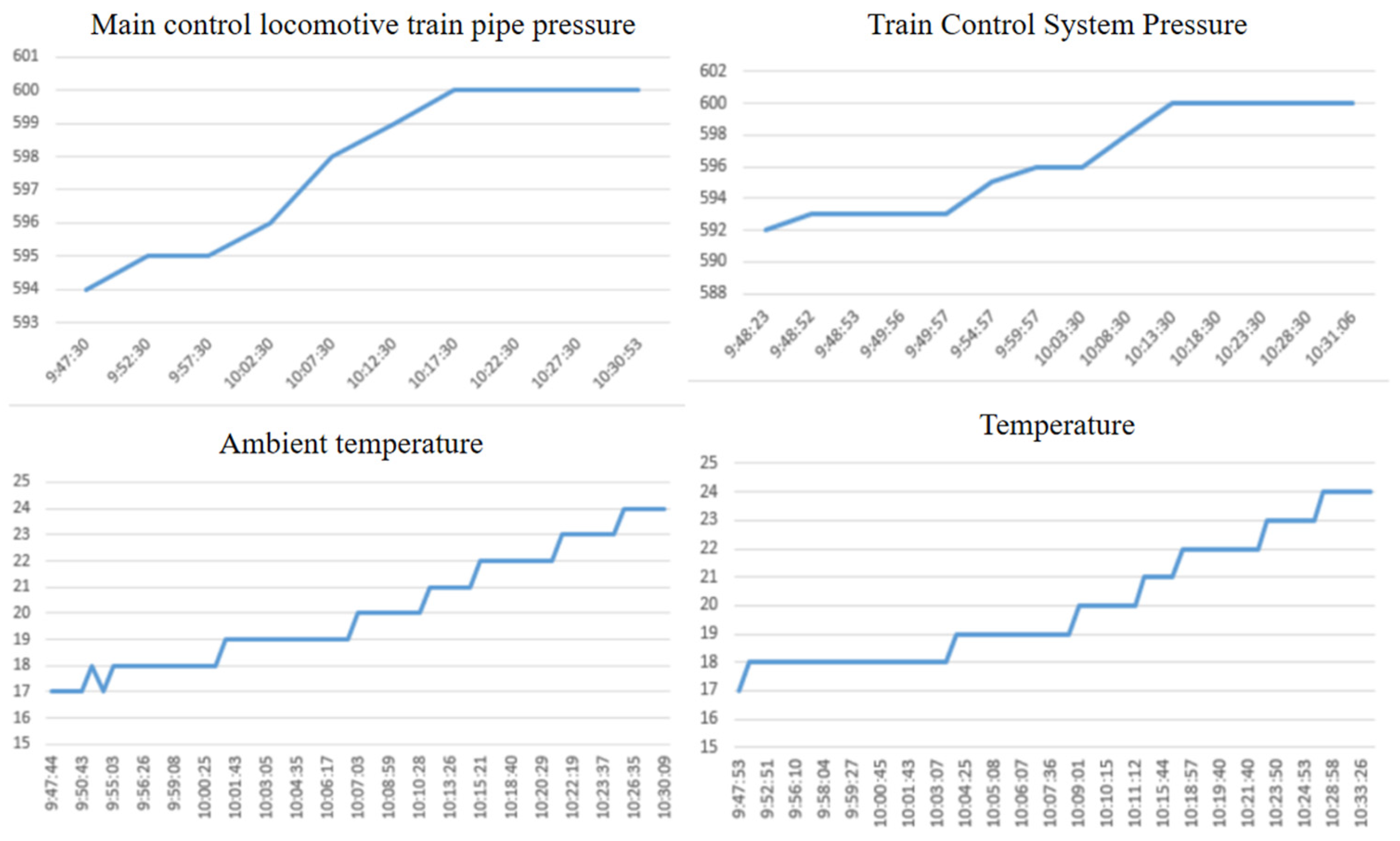 2]. As the train brake pipe remains at constant pressure prior to pressure-reduction braking, external temperature effects primarily manifest as temperature increases causing a rise in brake pipe pressure. Should such fluctuations occur during the initial braking phase, the elevated pressure will compound the pressure reduction, directly causing the actual pressure reduction to exceed the preset range (e.g., exceeding 55 kPa). This will result in an abnormal increase in the train’s overall braking force. The implementation of relief operations in such conditions gives rise to substantial longitudinal impulses between carriages, thereby posing a grave threat to operational safety and equipment longevity. In order to mitigate the aforementioned risk, the locomotive operations management department has mandated emergency stops for relief when train pipe pressure reduction exceeds 55 kPa [