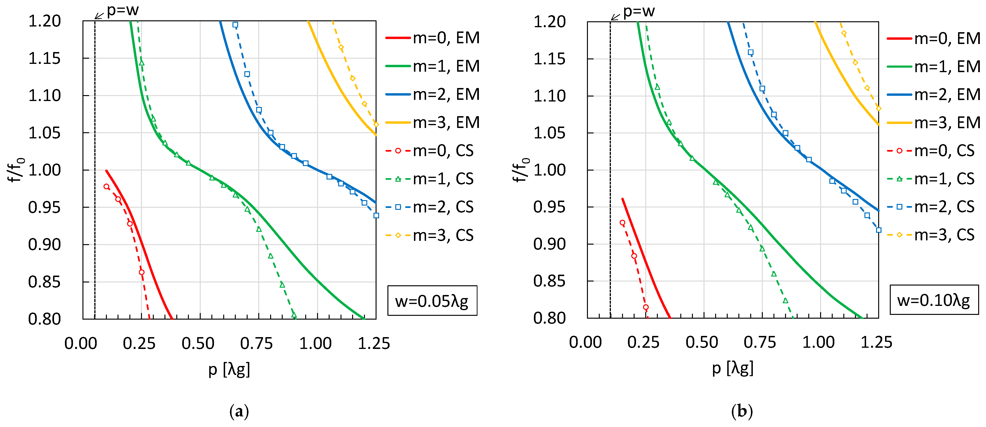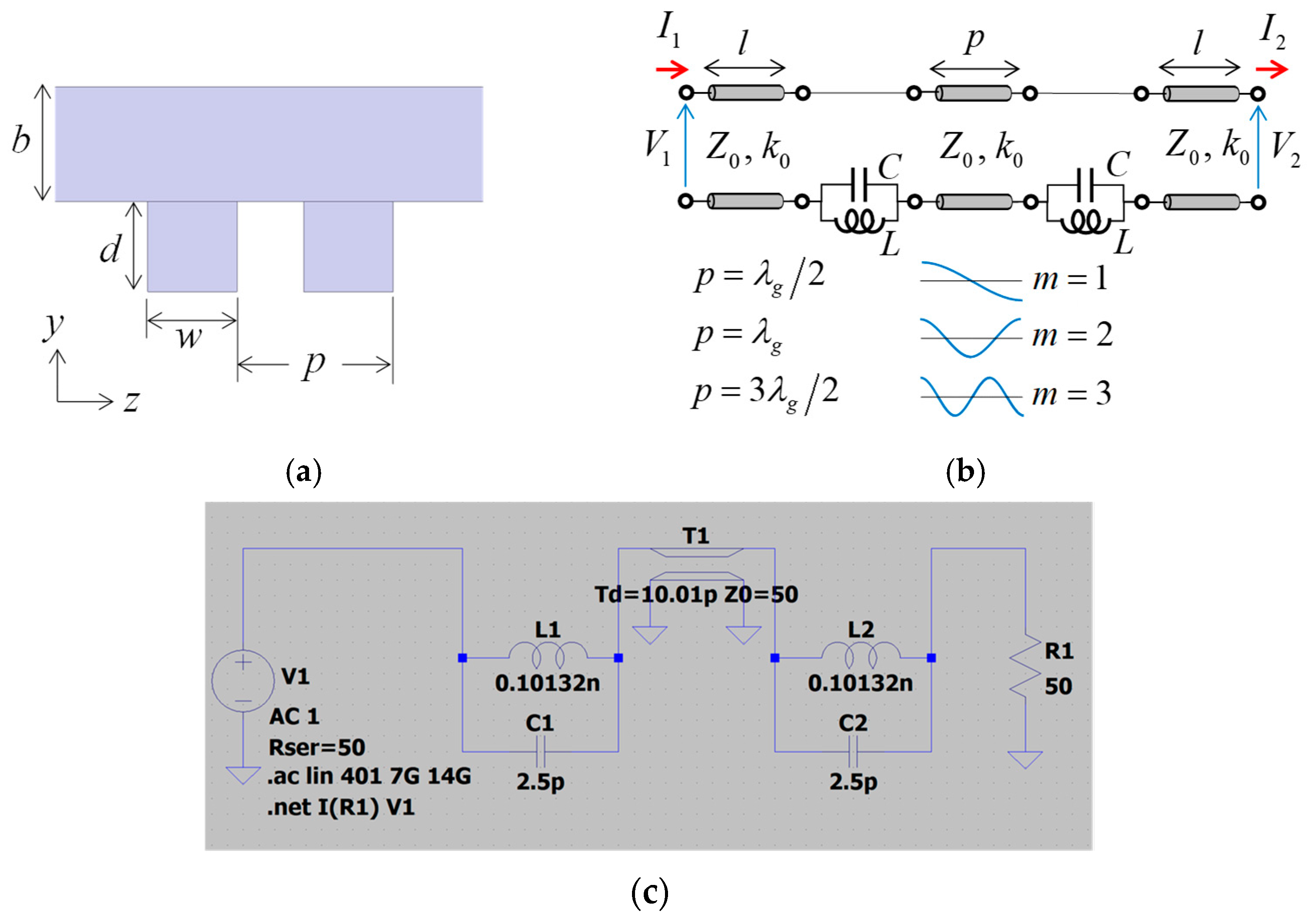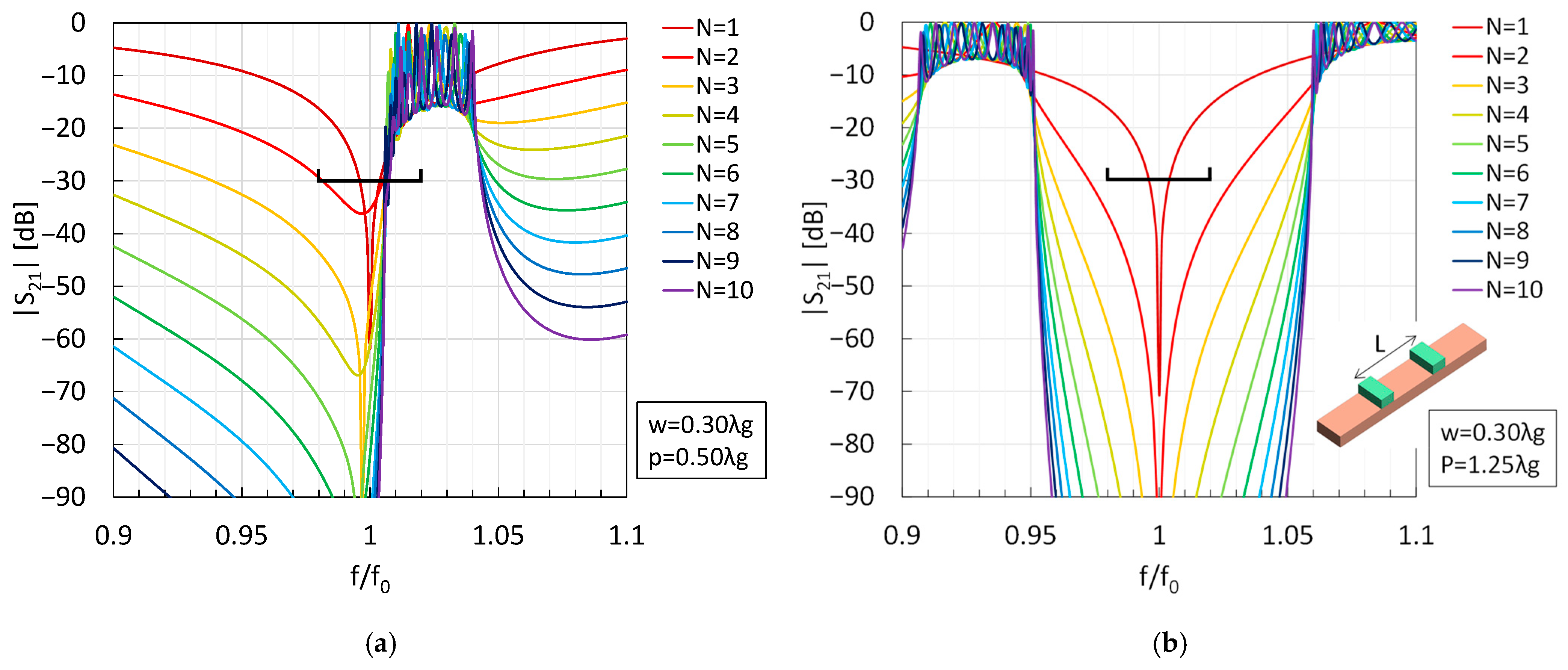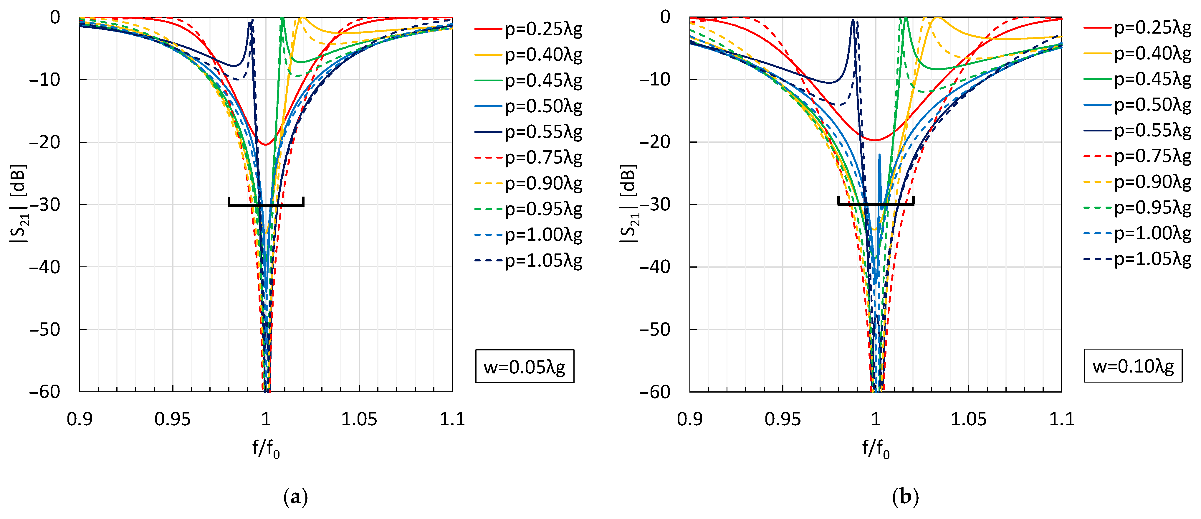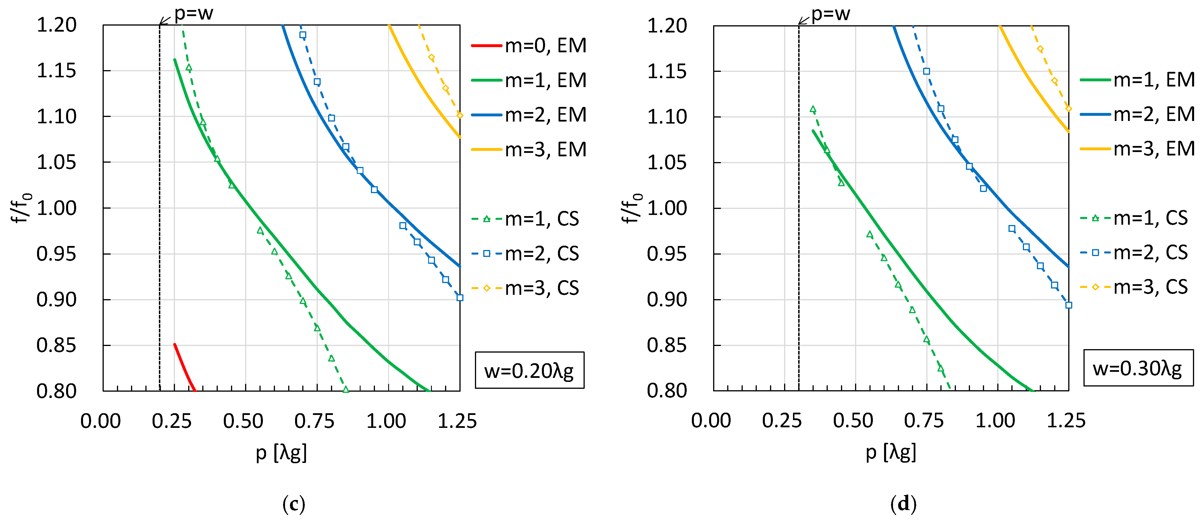 - Lech, R.; Mazur, J. Propagation in rectangular waveguides periodically loaded with cylindrical posts. IEEE Microw. Wirel. Compon. Lett. 2004, 14, 177–179. [Google Scholar] [CrossRef]