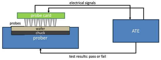 The wafer-level test mainly performs electrical parameter testing, functional testing, performance testing, and process defect detection. The hardware equipment for the wafer test mainly includes the ATE, prober, and probe card, as shown in Figure 1. During the wafer test process, the wafer is positioned on the chuck in the prober. The wafer is vacuum-secured onto the chuck and transported synchronously with the chuck’s movement, enabling comprehensive testing of the entire wafer. The electrical signals generated by the ATE travel through the probe card and are transmitted to the pads on the chips, enabling testing of electrical performance parameters and functional verification. The ATE evaluates the electrical signals generated by the chips and transmits the test results, namely, the pass or fail signals, to the prober. Based on these signals, the prober generates a wafer map that includes pass and fail information.