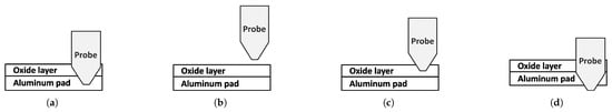 Figure 2b–d show three possible improper scenarios. Several factors could cause the three scenarios. If the settings of the overdrive parameters for the probes are incorrect during testing, the probe tips may not contact the pads, resulting in an open-circuit test outcome (false positive), as shown in Figure 2b,c. A more severe issue is that the probes penetrate the pads (physical defect) and cause a short-circuit test outcome, as shown in Figure 2d. As the wafer test proceeds, the dimensions of the probe tips can change. The rough tips of the probes may not be able to penetrate the oxide layer to contact the pads, as shown in Figure 2c, while excessively small probe tips increase the probability of cracking of the pads, as shown in Figure 2d. Furthermore, prolonged testing can lead to contamination of the probe tips with oxides, which impedes contact between the probes and pads, resulting in an open-circuit test result, as shown in Figure 2c. Finally, if the wafer is not perfectly adsorbed on the chuck or if the chuck and probe card are not aligned in parallel, any of the three scenarios depicted in Figure 2b–d may also occur.