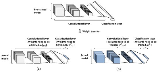 Model generation based on inductive transfer learning. The blue color indicates the parts finely adjusted. (a) Inductive transfer learning without the fine-tuning of the convolutional layer. (b) Inductive transfer learning with the fine-tuning of the convolutional layer.