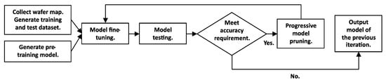 To achieve this goal, we propose a model development flow based on progressive pruning [23], as shown in Figure 5. The wafer map dataset and the pre-trained CNN model are prepared first. Secondly, the actual model is generated by transfer learning and is fine-tuned with the training dataset. The test dataset is then inputted to evaluate the accuracy of the model. If the accuracy meets the requirement, the model is pruned progressively. Afterwards, the model goes back to the fine-tuning stage. The iterative process continues until the model cannot be further pruned under the accuracy constraint. In the next, we introduce the progressive pruning method used in the flow.