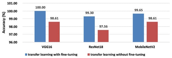 To evaluate the accuracy of the proposed detection method, we compared it to two methods for the defect detection task using the training and validation datasets. One method included training a VGG16 model with the training data from scratch, called VGG16-noTL. The other used the classical support vector machine (SVM) method [24]. Also, the proposed method was implemented in two versions, one without fine-tuning of the CON layers (VGG16-TL-noFT) and one with fine-tuning of the CON layers (VGG16-TL-FT).