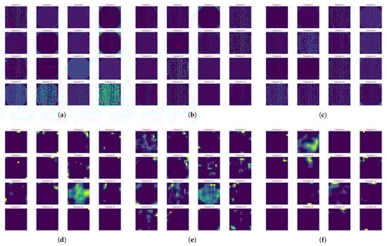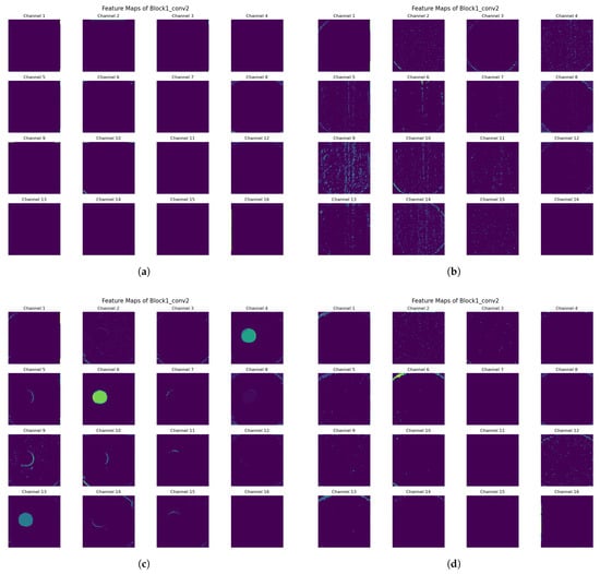 Furthermore, we visualize the corresponding feature maps of the model to provide insight into how the neural network model works during defect detection. The first 16 channels of the second convolutional layer are illustrated in Figure 7, where Figure 7a–d display extracted features corresponding to the wafer maps shown in Figure 3, respectively. Taking the “CPF” category as an example, it can be observed that the linear pattern present in the wafer map is effectively extracted and represented in the feature maps. Therefore, the trained model performs as expected.