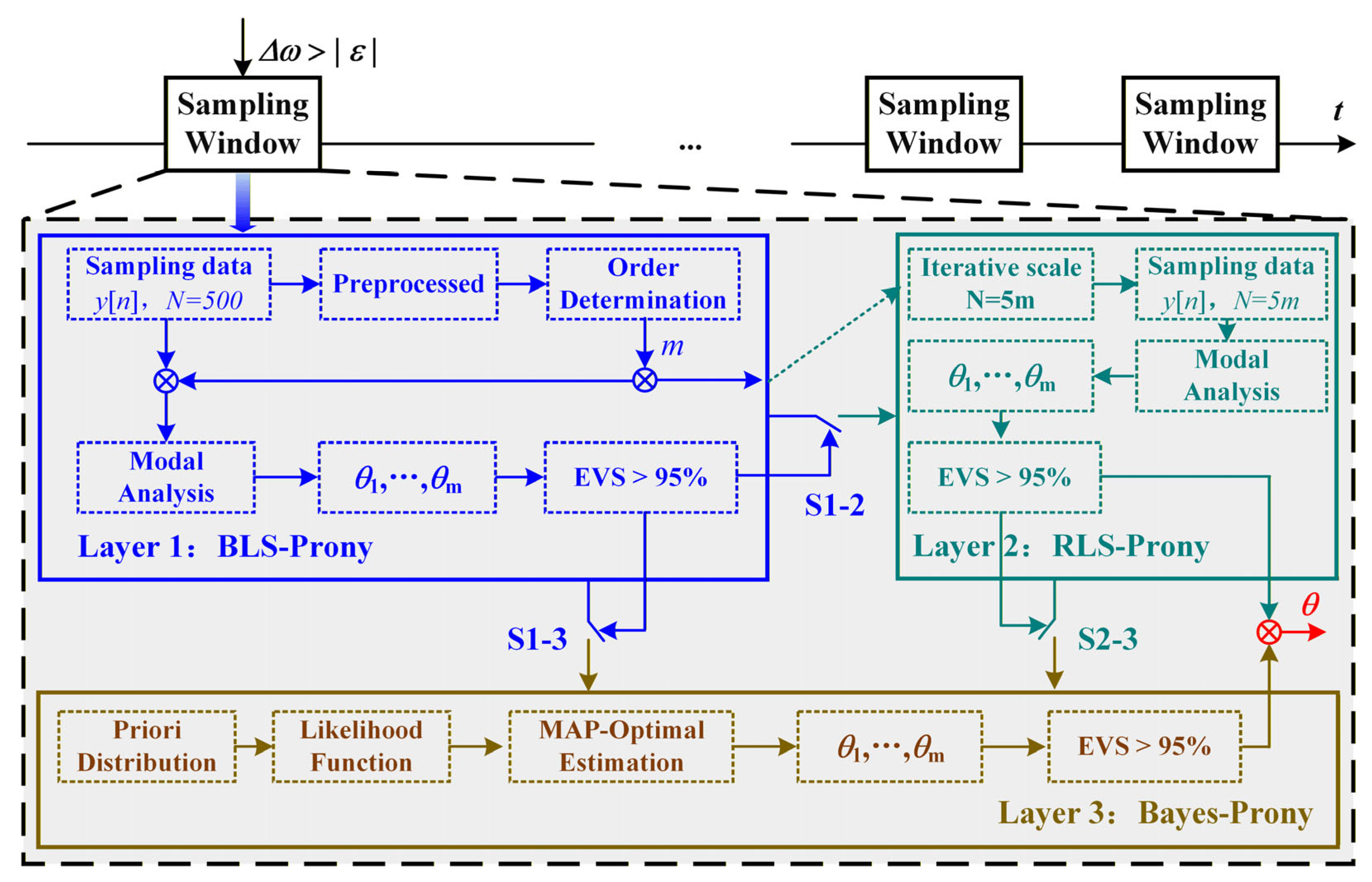 - The proposed strategy implements hierarchical decision making based on the sparsity and noise situation of the real signal. Among them, BLS-Prony and RLS-Prony are used to extract modals from high SNR signals, and Bayes–Prony is invoked as the last layer when their recognized modals cannot pass the calibration.