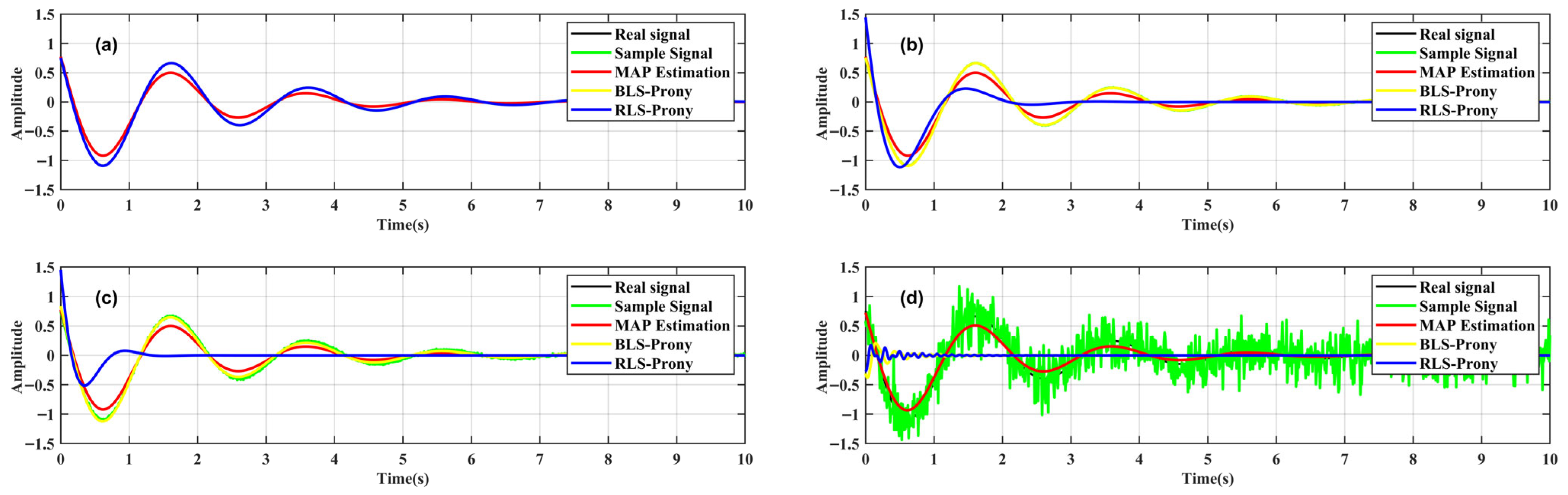 - A Bayes–Prony algorithm is proposed, which replaces the point estimation of the Prony algorithm with probabilistic estimation and solves the problem of the modal equations of noise-containing signals being unable to converge.