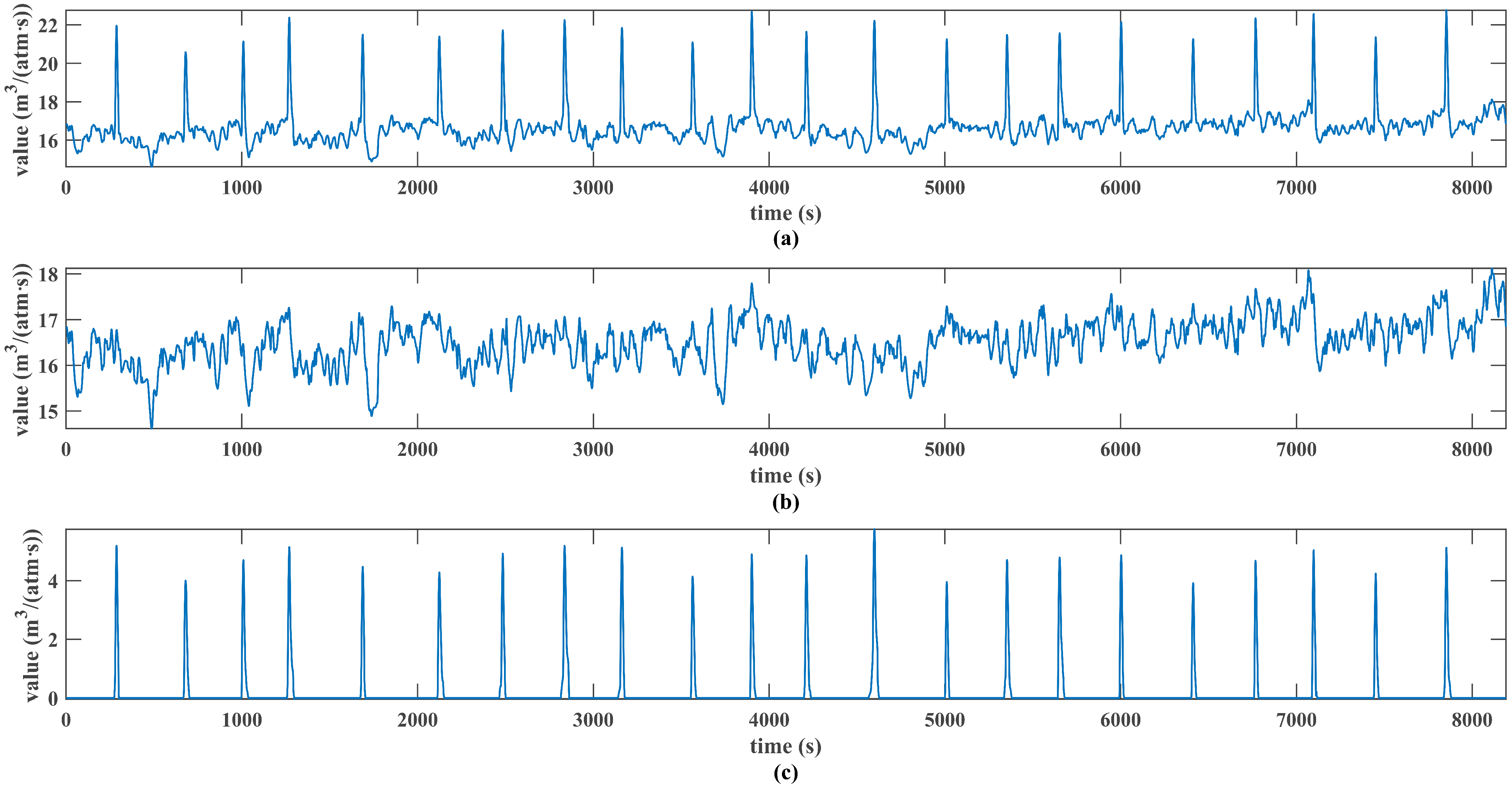 - Nonstationarity: As illustrated in Figure 1b, due to the periodic equipment switching of the heated air subsystem, there occur some upward or downward spikes in the data, resulting in the data’s nonstationarity [10]. Such nonstationarity will cause a modal aliasing phenomenon when using time series decomposition methods for sequence decomposition, causing “data contaminated”. A detailed introduction to this section will be provided in Section 3.1.