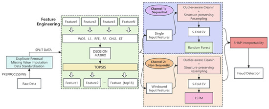 This paper proposes a hybrid framework for credit card fraud detection that combines two complementary channels—non-sequential and sequential patterns—as illustrated in Figure 1. The first channel primarily identifies and evaluates static transaction features, including multi-indicator feature engineering, structure-preserving resampling, and robust classification model building. For feature selection, we synthesised six mainstream methods and fused their results using the TOPSIS multi-attribute decision method to select the optimal subset. To mitigate extreme class imbalance and outlier interference, we applied structure-preserving resampling for training data. This effectively preserves the original data distribution during testing, ensuring more objective model evaluation results. The classifier employs the Random Forest algorithm, which demonstrates significant advantages when handling high-dimensional, sparse, and nonlinear features. It is important that one-channel models rely solely on the static attributes of individual transactions, without considering temporal relationships between transactions. The second channel specifically handles time-dependent relationships within transaction sequences. Using a sliding window mechanism, it combines each target transaction with its preceding historical transactions to form input sequences [49]. This hybrid framework simultaneously evaluates static attributes and models dynamic behaviour, significantly enhancing the system’s adaptability and accuracy in practical credit card fraud detection. Subsequent sections will detail the specific implementation steps, experimental procedures, and validation results of this method.