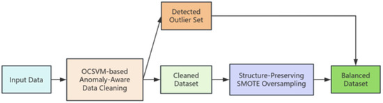 Furthermore, to enhance training sample effectiveness and model robustness against noise, this paper adopts a “clean first, then balance” principle, performing oversampling only within the cleaned subspace. OCSVM (One-Class Support Vector Machine) is employed as the outlier detection tool. OCSVM automatically identifies outliers based on sample distributions, offering dynamic adaptive capabilities without requiring manual threshold settings. This approach avoids repetitive multi-round detection, streamlining the data cleaning process. Concurrently, we experimented with and compared several other mainstream anomaly detection methods, including Local Outlier Factor (LOF), Isolation Forest, and Elliptical Envelope. Experimental results demonstrate that when combined with SMOTE for class imbalance handling, OCSVM more effectively removes noise and enhances model performance. The key parameters in the preprocessing stage of all experiments were fixed to maintain methodological consistency.