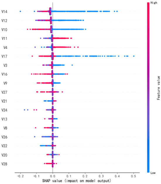 Model interpretability is a critical component for establishing trust and transparency in credit card fraud detection systems. This study incorporates the SHAP (Shapley Additive exPlanations) method into the random forest model to quantify and visualise the influence of each feature on the model’s prediction outcomes. By integrating SHAP analysis, the model’s decision-making process can be intuitively explained, revealing the specific contributions of different features to classification results. Figure 5 displays the SHAP summary plot for the 18 primary features selected via TOPSIS. Features are ranked by their average absolute SHAP value, reflecting their relative importance in fraud identification.