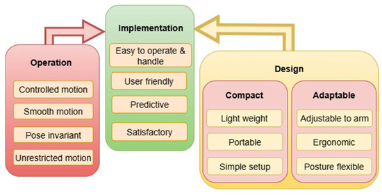 Requirements referring to operation aspects involve the device’s ability to deliver smooth controlled motion without restricting natural limb movement. It should maintain pose invariance by functioning consistently across varying arm positions, and it should not introduce motion limitations due to its mechanical structure or functional characteristics.