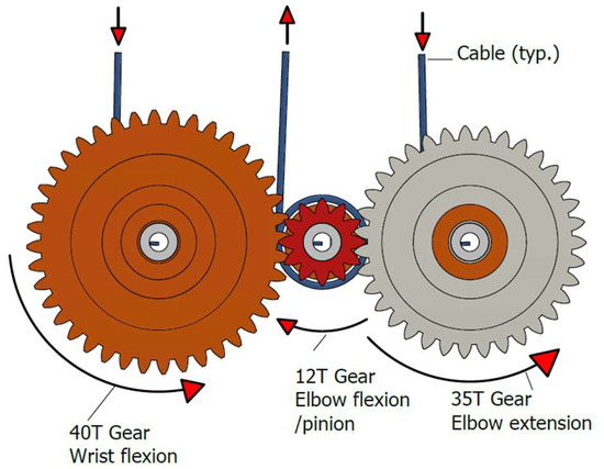 Cable movement is driven by rotating drums around which the cables are wound. As the drum rotates in one direction, it winds the cable; in the opposite direction, it releases it. Each actuation cable has a dedicated drum named after the cable it controls. At the end of each drum a spur gear is installed, as illustrated in Figure 3. The gear for the flexion cable is a 12 teeth gear which is centrally located, acts as the pinion, and is mounted coaxially to the driving motor’s rotating shaft. The elbow extension and wrist flexion gears are positioned on either side, meshing with the central pinion. The attachment points for the elbow flexion, elbow extension, and wrist flexion cable are fixed on their respective drums.