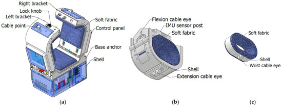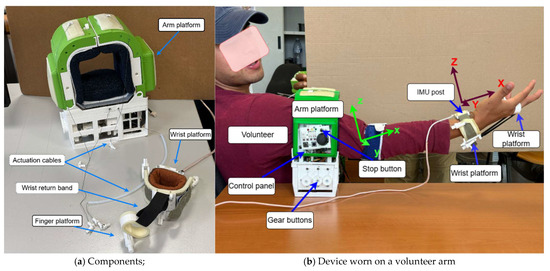 The mechanical design of the platforms is obtained considering the average size of the human arm and is explained in the paper [3,39]. In particular, the arm platform can fit different arm sizes since the cuff is adjustable and at the same time inflatable. For small arms, if the cuff adjustment does not suffice, then it is inflated to close the aperture to fit the arm. The wearability and comfort of the device are addressed with proper mechanical design with special attention to the fixing parts of the device in contact with the assisted arm tissues. The cuff of the device inflates by creating a cushion to hold the arm in a steady position but not to raise pressure to risky levels, achieving comfort aims. If the bicep inflates and generates pressure beyond the threshold pressure, the cuff is programmed to deflate. Portability is not affected by the pneumatic system since it is composed of pipes, minipump, and inflatable bladder with small sizes. An easy wearability is ensured with the design of the arm platform with the opening/closing fingers as shown in Figure 4a; the wrist platform is easily worn as a bracelet as well as the finger platform is as a finger ring, as shown in Figure 4b,c, respectively.