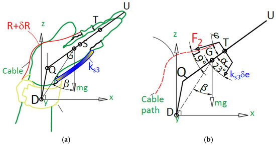 A scheme for wrist motion assisted by Table ASSIST-EW device in Figure 2 and Figure 4; (a) fully flexed wrist; (b) fully extended wrist. (D: wrist platform anchor point; Q: wrist point at carpometacarpal joint; G: hand centre of mass; S: metacarpophalangeal joint point; T: proximal interphalangeal joint point; U: fingertip).